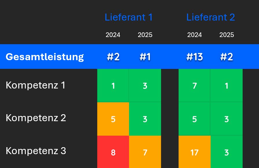 Die Berater der Advantage Group sehen nicht nur Ihre Daten – sie analysieren Feedback und Leistungskennzahlen über Ihre gesamte Wettbewerbslandschaft hinweg, einschließlich der führenden Unternehmen Ihrer Kategorie. Diese breite Marktsicht ermöglicht es uns, Best-Practice-Strategien zu identifizieren, Lücken in Ihrem Ansatz aufzuzeigen und datengestützte Empfehlungen zu geben, die Ihnen helfen, Wettbewerber zu übertreffen und Handelsbeziehungen zu stärken.